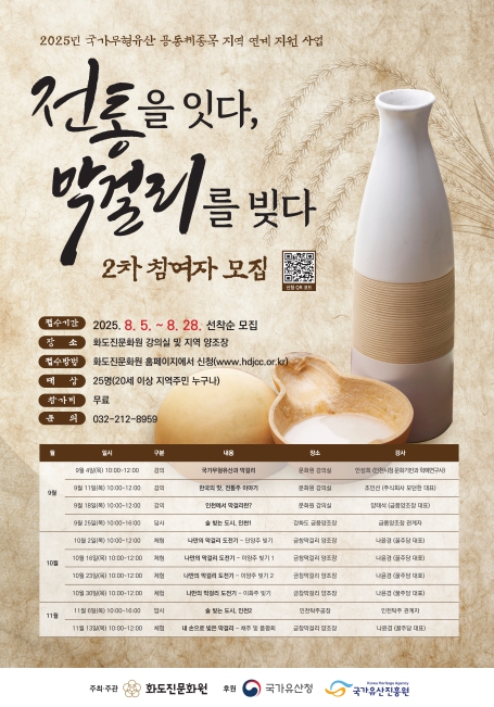 인천 동구 화도진문화원이 오는 9월 4일부터 '전통을 잇다, 막걸리를 빚다' 프로그램을 진행한다고 밝혔다. 국가유산청 공모사업에 선정될 만큼 그 가치를 인정받은 이 프로그램은, '막걸리 빚기'를 통해 잊…