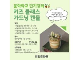 함양문화원(원장 정상기)은 군민들에게 문화예술 체험 기회를 제공하기 위해 오는 4월 단기강좌 '글라스아트 클래스'와 '키즈 캔들 클래스'를 운영한다.이번 강좌는 짧은 기간 동안 부담 없이 참여할 수 있