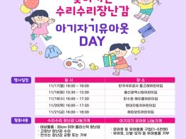 울산시는 오는 17일부터 21일까지 5일간 관내 주요 직장어린이집을 대상으로 ‘우리아이, 행복배달 사업(프로젝트): 찾아가는 장난감·유아옷 데이(DAY)’ 행사를 진행한다고 밝혔다. 이번 행사는 ‘울부심