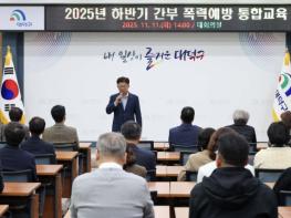 대전 대덕구는 11일 구청 대회의실에서 기관장 및 간부 공무원 53명을 대상으로 ‘2025년 하반기 폭력예방 통합교육’을 실시했다. 이번 교육은 공공기관 내 성희롱·성폭력·가정폭력·성매매를 예방하고, 리