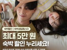 [숙박할인] 숙박세일페스타◆ 최대 5만 원 숙박 할인 누리세요!비수도권지역 7만 원 이상 숙박상품 이용 시 3만 원, 2만 원 이상 7만 원 미만 상품 이용 시 2만 원 할인- 운영기간: 8.20.(수)~12.7.(일)- 특
