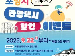 포항시는 추석 연휴와 가을 관광 성수기를 맞아 ‘타보소 관광택시 할인 이벤트’를 오는 22일부터 예산 소진 시까지 진행한다. 이번 특별 프로모션은 지역을 찾는 관광객들의 교통 편의를 제공하고 지역