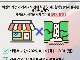 서귀포시는 광복 80주년을 기념하여 8월 14일부터 31일까지 서귀포시 소재 음식점 영수증을 지참한 방문객에게 입장료 50%를 할인하는 특별 할인 행사를 진행한다.이번 행사는 광복 80주년 축하와 지역경제