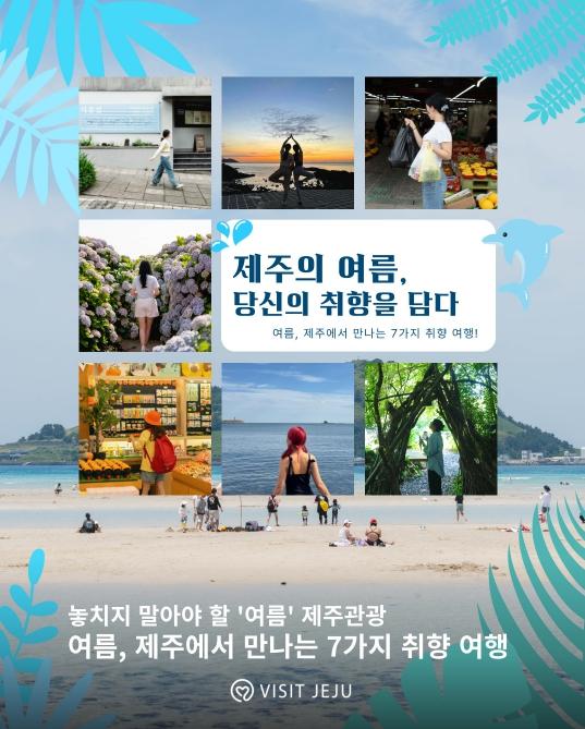 올여름 7가지 제주 취향 여행은 △문화여행자(제주 미술, 예술 콘텐츠 경험 추구) △웰니스 선호자(여름 요가, 웰니스 활동 선호) △자연 선호자(여름꽃 자연 감상 선호) △쇼핑 트레블러(원도심 로컬 쇼핑 경험 추구) △미식 탐방자(이열치열 vs 이한치열 여름 음식 선호) △어드벤처 추구자(가족 용천수 vs 친구 스노클링 경험 추구) △매력 탐방자(제주의 숨은 명소, 국가 유산 탐방 추구) 등으로 구성됐다.