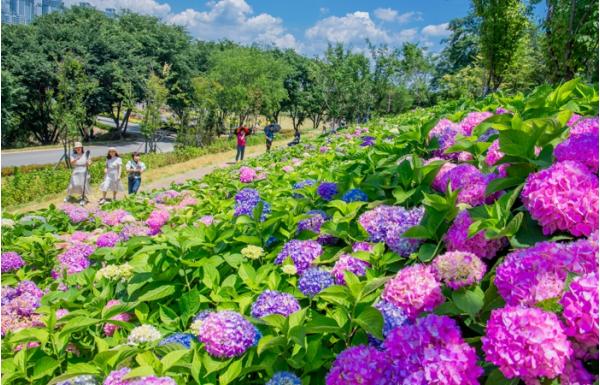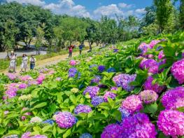 구미시는 2022년부터 시작한 ‘다온숲 수국 정원 조성’ 사업을 통해 2년간 17종 1만4천여 본의 수국을 식재하며 경관을 조성한 데 이어, 올해에는 1만7천여 본을 추가해 총 43종 3만1,900본까지 규모를 확대했다. 수국의 색감과 개화시기가 다양한 품종으로 구성돼 6월부터 7월까지 장관을 이루고 있으며, 매지컬블루벨, 루비레드, 하이오션 등 보기 드문 품종들이 정원을 화려하게 수놓고 있다.