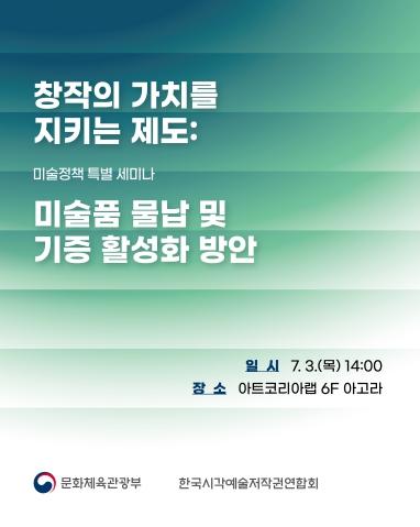 [한식일보] 문화체육관광부는 (사)한국시각예술저작권연합회와 함께 7월 3일 오후 2시, 아트코리아랩 아고라(서울 종로구)에서 미술품 물납* 활성화를 위한 미술 정책 특별 세미나를 개최한다.