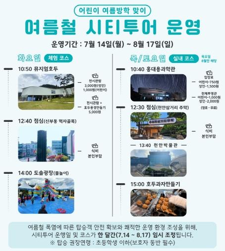 시는 여름철 폭염과 폭우에 따른 탑승자의 안전을 고려해 기존 시티투어 코스를 중단하고 한 달간 어린이 체험코스와 실내 코스로 변경 운영한다.