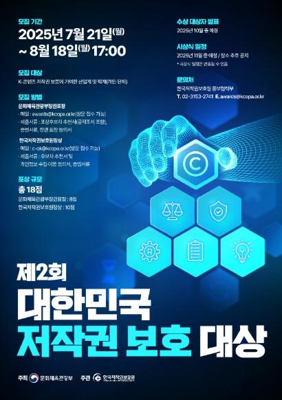 [한식일보] 문화체육관광부는 한국저작권보호원과 함께 7월 21일부터 8월 18일까지 ‘제2회 대한민국 저작권 보호 대상’ 후보자에 대한 대국민 추천을 받는다.