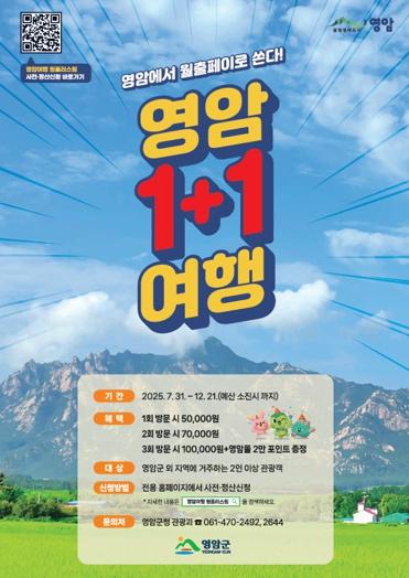 [한식일보] 영암군이 이달 말일부터 올해 말까지 2인 이상 관광객에게 최대 24만원의 지역화폐 등을 주는 ‘영암여행 원플러스원(1+1)’ 사업을 진행한다.