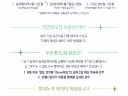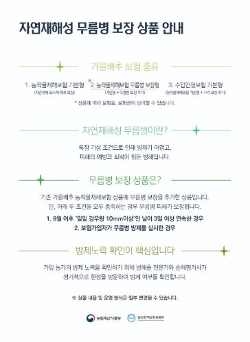 가을배추의 자연재해성 무름병 보장 상품은 사전에 가입 수요를 제출하고 수확기까지 병해충 방제 등 재배 관리를 직접 수행하는 농업인을 대상으로 8월 11일부터 시범 운영되며, 가입 농업인은 자연재해 등 보장하는 재해로 인한 수확량 감소와 함께 자연재해성 무름병을 추가로 보장받는다.