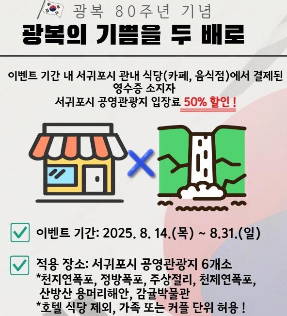 서귀포시는 이번 이벤트를 통해 광복 80주년의 역사적 의미와 지역 관광의 가치를 되새기고 저역 음식점 매출 증대를 통해 시민 ·소상공인 체감도 제고에 실질적인 도움이 될 것이라고 전망하고 있다.