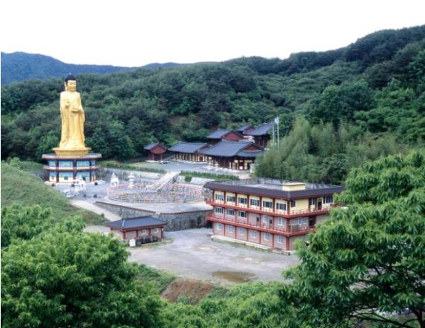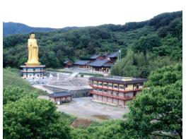 절 마당에는 40m에 달하는 황동약사여래입상이 푸른 하늘을 배경으로 웅장하게 서서 신비한 아우라를 자아낸다.