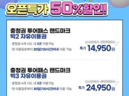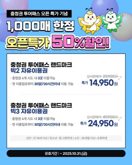 충청권투어패스는 충청권의 주요 관광지를 하나의 패스로 편리하게 이용할 수 있는 통합 이용권으로 평상시에도 관광지 이용요금 대비 약 50% 할인된 가격으로 판매되는 합리적인 관광상품이다. 여기에 더해 이번 프로모션 기간 동안에는 기존 판매가에서 추가로 50% 할인된 가격에 구입할 수 있어 정상가와 비교하면 최대 75% 할인 혜택을 누릴 수 있다.