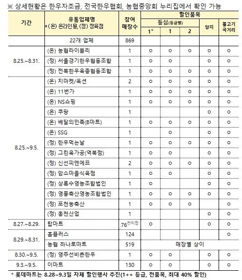 대형 온라인몰 등은 8월 25일부터, 전국 농협 하나로마트 519개소와 주요 대형마트 등은 8월 29일부터 할인행사가 실시된다.