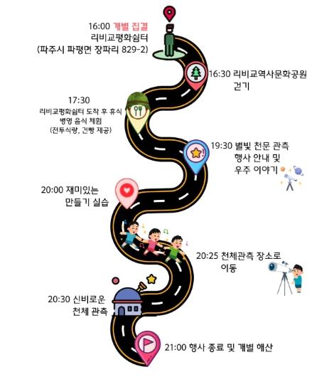 또한 일몰과 함께 본격적인 “별빛 여행”으로 천문 관측에 대한 안내를 받고 직접 참여하는 만들기 실습 시간을 가진 후, 천체를 관측하며 서로 우주 이야기를 나누는 공감 소통의 시간을 갖는다.