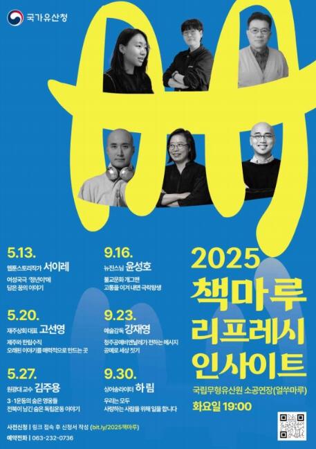 [한식일보] 국가유산청은 9월 16일과 23일, 30일 오후 7시에 총 3회에 걸쳐 국립무형유산원 소공연장(전북 전주시)에서 '2025 하반기 ‘무형유산 책마루’ 인문학 강연'을 개최한다.