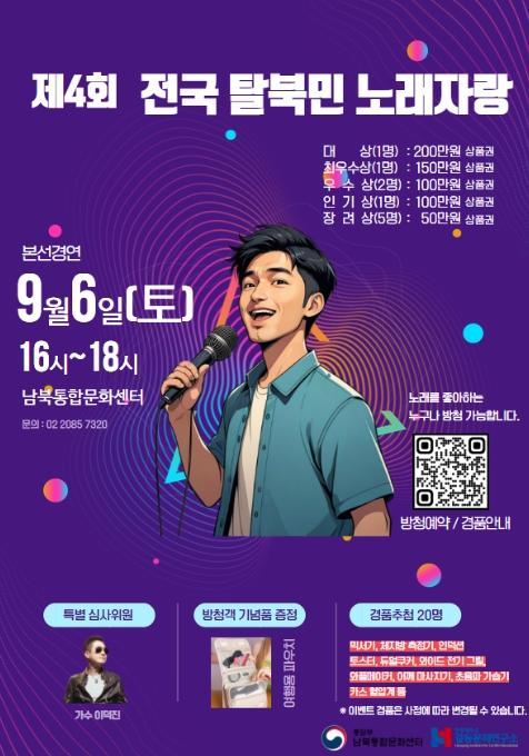 [한식일보] 통일부 남북통합문화센터(서울시 강서구 소재)는 9월 6일 오후 4시, '전국 탈북민 노래자랑'을 개최한다.
