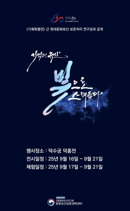 [한식일보] 국가유산청 국립문화유산연구원 문화유산보존과학센터는 광복 80주년을 맞아 오는 9월 16일부터 21일까지 6일간 덕수궁 덕홍전(서울 중구)에서 광복과 독립운동의 상징적 유물이 보존처리를 통해 어떻게 되살아났는지 그 과정을 영상과 사진으로 조명한 기획전 '기억의 유산, 빛으로 스며들다'를 개최하고, 9월 16일 오후 2시에 개막식을 개최한다.