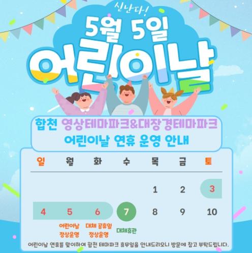 [한식일보] 합천군은 5월 3일부터 6일까지 어린이날 연휴에 합천영상테마파크와 대장경테마파크를 정상 운영한다고 밝혔다.