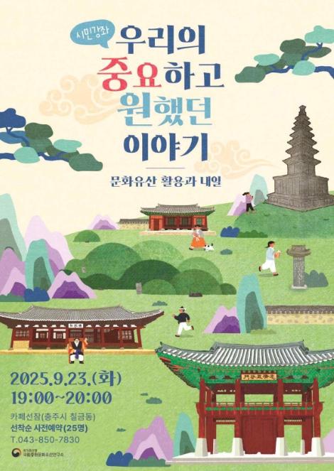 [한식일보] 국가유산청 국립문화유산연구원 국립중원문화유산연구소는 오는 23일 오후 7시 충주 탄금공원 인근에서 ‘우리의 중원(중요하고 원했던) 이야기’ 하반기 시민강좌를 개최한다.