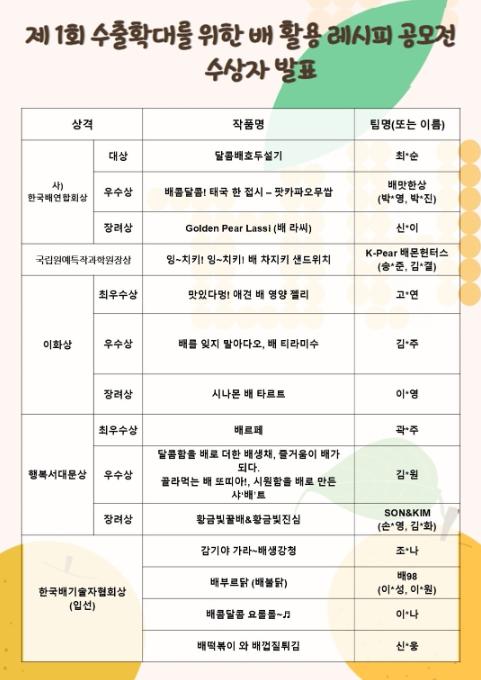 이번 공모전은 한국 배의 우수성을 알리고 다양한 배 활용 아이디어를 발굴하고자 7월 25일부터 8월 20일까지 진행했다. 이화여자대학교와 서대문구가 주최하고 국립원예특작과학원 배연구센터와 (사)한국배연합회가 주관했다.