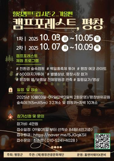 평창관광문화재단 관계자는“지난여름 캠프에 이어, 이번 가을 캠프에도 많은 가족의 참여를 기대한다”라며, “올가을, 평창에서 나와 가족을 위한 힐링을 경험하시길 바란다”라고 전했다.