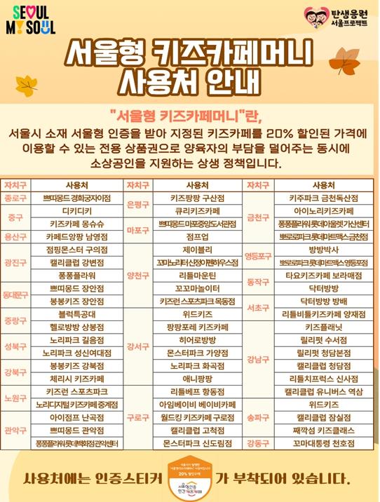 ‘서울형 키즈카페머니’는 민간 키즈카페를 20% 할인된 가격에 이용할 수 있는 전용 상품권으로, 현재 서울형 인증기준을 통과한 서울시내 키즈카페 60개소('25.9. 기준)에서 사용할 수 있다. ’23년 9월 첫 발행 이후 현재까지 약 9만 9천여 명이 20% 할인 혜택을 누렸다.