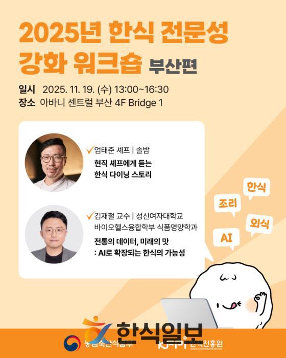 이어 11월 19일 (수) 아바니 센트럴 부산에서 열리는 부산 편에서는 엄태준 셰프의 강연에 더해 성신여자대학교 김재철 교수가 ‘전통의 데이터, 미래의 맛 – AI로 확장되는 한식의 가능성’을 주제로 강연한다. 마지막 대전 편은 11월 25일 (화) 호텔 인터시티에서 열릴 예정이며, 부산 편과 동일한 구성으로 진행된다.