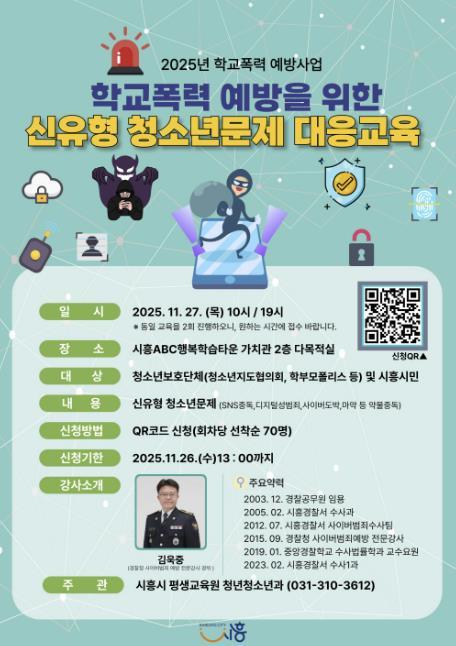 이번 교육은 청소년지도협의회 및 어머니ㆍ학부모폴리스 등 관내 청소년보호단체를 비롯한 모든 시흥시민을 대상으로 진행되며, 사이버범죄, 사이버도박, 약물중독 등 최근 급증하고 있는 청소년 문제에 따른 학교폭력을 예방하고자 마련됐다.
