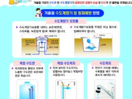 수도계량기나 외부에 노출된 수도관은 헌옷, 스티로폼, 헝겊 등으로 감싸 찬바람이 들어가지 않도록 보온해야 하며, 강추위가 지속될 경우에는 수도꼭지를 약하게 틀어 물이 조금씩 흐르도록 해 동파를 예방할 수 있다.