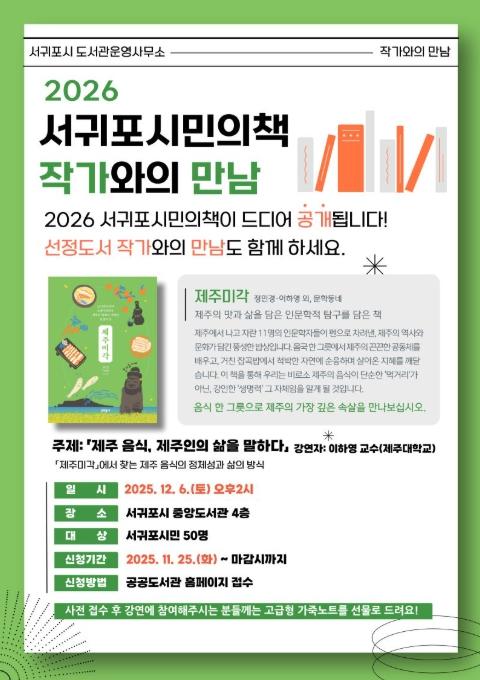 [한식일보] 서귀포시는 12월 6일 오후 2시, 서귀포시 중앙도서관에서 2026년 서귀포시민의 책으로 선정된 '제주미각'의 저자 이하영 교수를 초청해 작가와의 만남을 운영한다.