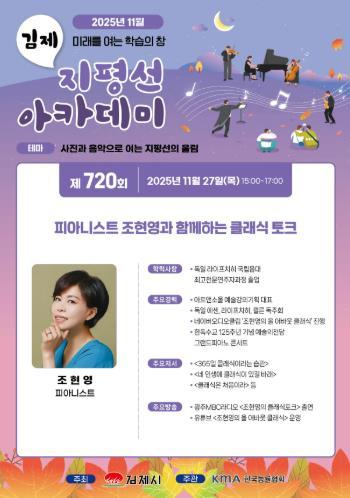 [한식일보] 다양한 분야의 명사를 초청해 시민의 문화적 소양의 높이고 삶의 품격을 더하는 교양 강좌인 김제지평선아카데미가 오는 27일 제720회 강좌에 조현영 아트앤소울 예술강의기획 대표를 초청해 “피아니스트 조현영과 함께하는 클래식 토크”라는 주제로 강연을 진행한다.