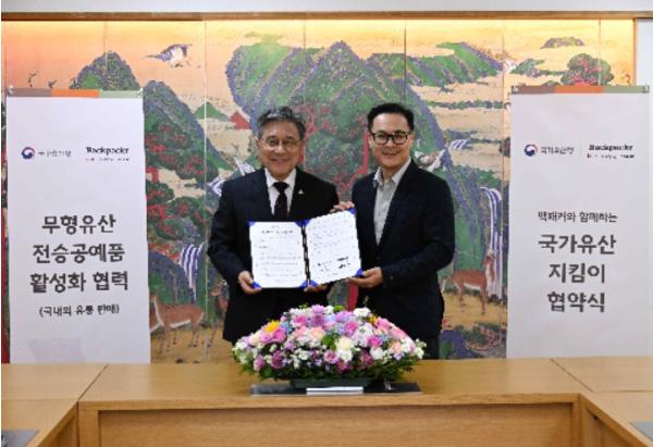 [한식일보] 국가유산청은 온라인 상거래(커머스) 기업 ㈜백패커와 11월 21일 오후 2시 국립고궁박물관 회의실(서울 종로구)에서 무형유산 전승 활동지원 등을 위한 국가유산지킴이 협약을 체결했다.