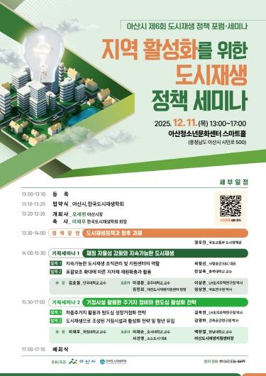 한편, 세미나는 누구나 참여할 수 있으며 자세한 내용은 아산시 도시재생지원센터 블로그 및 페이스북을 통해 확인할 수 있다. 신청은 전화, 포스터 QR코드, 방문 접수를 통해 가능하다. 시는 ‘2025~2026 충남·아산 방문의 해’를 맞아 시민들의 많은 참여와 관심 바란다고 밝혔다.