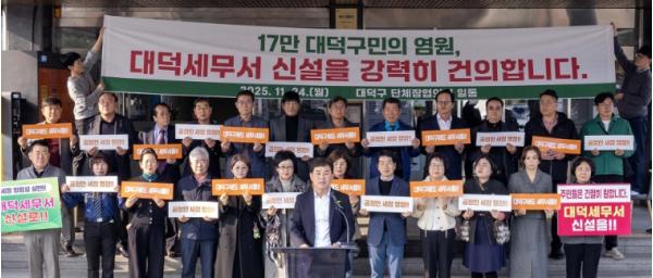 [한식일보] 대전 대덕구는 대덕구단체장협의회가 24일 구청 현관에서 ‘대덕세무서(가칭)’ 조속 신설을 촉구하는 공식 건의문을 발표했다고 밝혔다.
