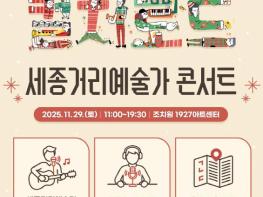 [한식일보] 세종시문화관광재단은 오는 11월 29일 오전 11시, 조치원읍 1927아트센터에서 ‘세종거리예술가 콘서트’를 개최한다.