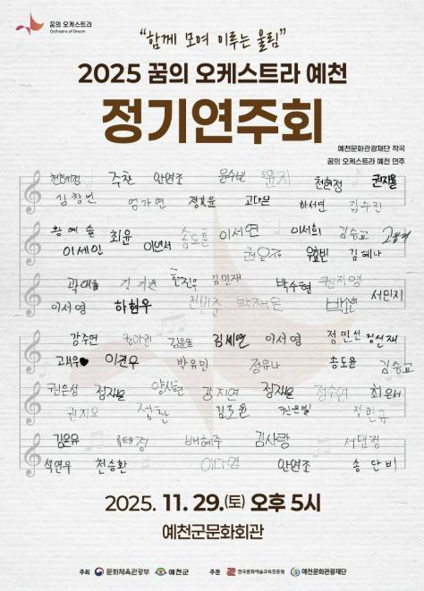 [한식일보] 예천문화관광재단은 오는 29일 오후 5시, 예천군문화회관에서 '2025 꿈의 오케스트라 ‘예천’ 정기연주회 '함께 모여 이루는 울림''을 개최한다.