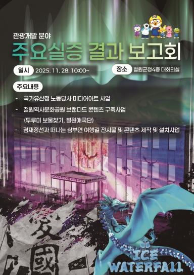 [한식일보] 철원군은 지역 관광 경쟁력 강화를 위해 추진한 다양한 실증 사업의 성과를 공유하는 자리를 마련한다. 2025.11.28일 오전 10시 철원군청 4층 대회의실에서 관광개발 분야 주요실증 결과보고회가 개최된다.