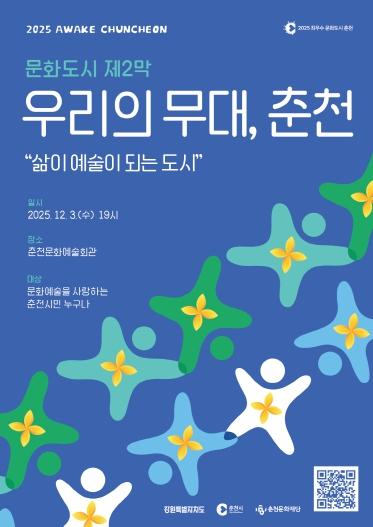 이 행사는 공연과 영상, 전시가 어우러진 축제형 구성으로 하나의 공연축제를 즐기듯 춘천 문화예술의 오늘과 내일을 자연스럽게 경험할 수 있도록 기획됐다.