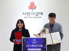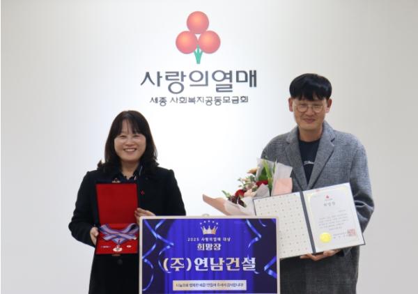 ㈜연남건설(대표 박성윤)은 사회복지공동모금회가 주최하는 ‘2025년 제12회 사랑의열매 대상’에서 기부분야 ‘희망장’을 수여해 전달식을 가졌다고 세종사회복지공동모금회(회장 박상혁)에서 전했다.