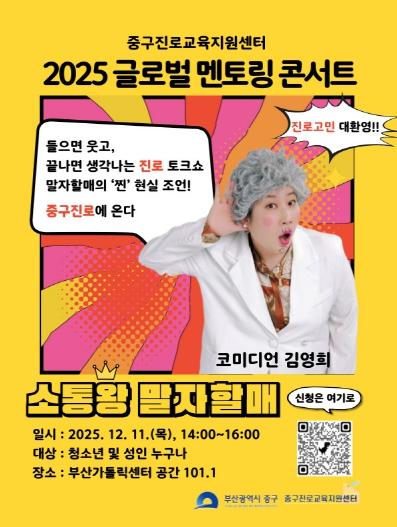 [한식일보] 부산 중구는 오는 11일 오후 2시 부산가톨릭센터 공간 101.1에서 ‘2025 글로벌멘토링 콘서트’가 개최한다고 밝혔다.