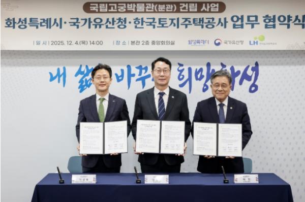 이날 시청 중앙회의실에서 열린 협약식에는 정명근 화성특례시장, 허민 국가유산청장, 이상욱 한국토지주택공사 사장직무대행(부사장)이 참석해, 분관 건립을 위한 상호 협력을 약속했다.
