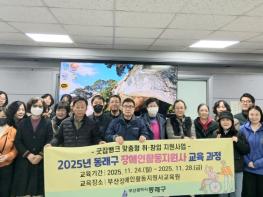 이번 교육은 40세 이상 동래구민을 대상으로 11월 24일부터 11월 28일까지 부산장애인활동지원사교육원에서 실시됐으며 장애인 활동 지원 개론, 활동 지원 서비스 기초 등 장애인 활동 지원에 관한 이론과 사례 중심 교육으로 진행됐다.