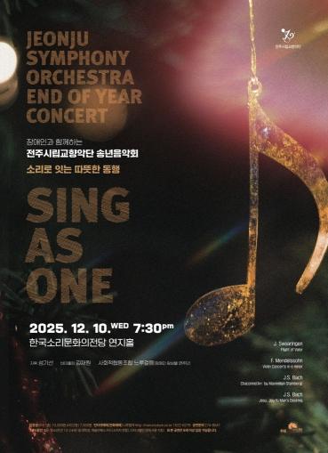 전주시립교향악단은 오는 10일 오후 7시 30분, 한국소리문화의전당 연지홀에서 장애인과 함께하는 송년음악회 ‘소리로 잇는 따뜻한 동행(Sing as One)’을 선보인다.