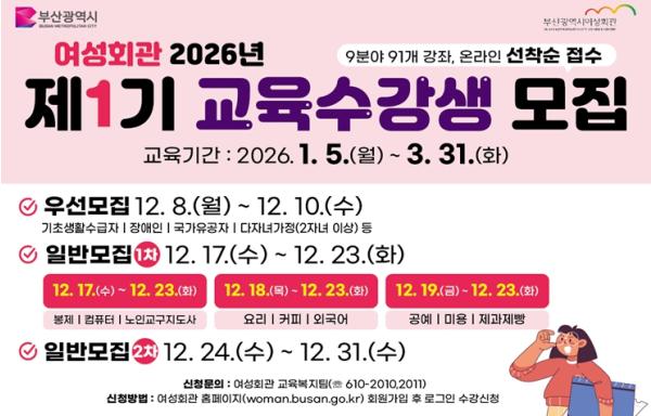 [한식일보] 부산시 여성회관은 내일(8일)부터 '2026년 제1기 교육과정' 수강생을 모집한다고 밝혔다.
