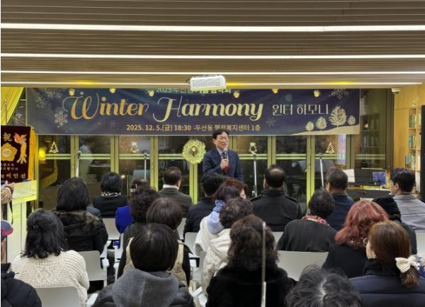 [한식일보] 대구 수성구 두산동 행정복지센터는 지난 5일 두산동 행정복지센터 1층 북카페에서 ‘두산동 윈터 하모니 음악회’를 개최해 100여 명의 지역 주민들에게 깊은 감동과 겨울의 낭만을 전했다.
