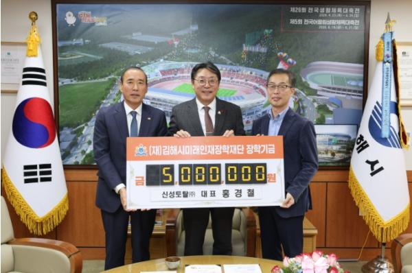 [한식일보] 김해시미래인재장학재단은 8일 신성토탈㈜(대표 홍경철)에서 장학기금 500만원을 기탁했다고 밝혔다. 신성토탈(주)은 2023년부터 3년째 매년 500만원씩 기탁하고 있다.
