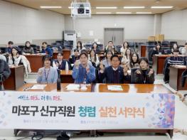 이날 신규 직원들은 청탁 근절과 직무수행의 공정성 등에 관한 '부정청탁 및 금품등 수수의 금지에 관한 법률'과 '서울특별시 마포구 공무원 행동강령'의 주요 내용을 담은 반부패 청렴서약서를 낭독했다.