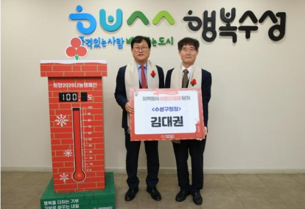 이날 공동모금회는 ‘따뜻한 겨울나기 지원 사업’ 성금도 함께 전달했으며, 기탁된 성금은 수성구 취약계층 575세대에 각 10만 원씩 지원될 예정이다.