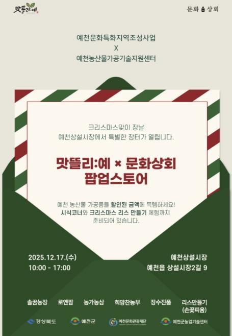 [한식일보] 예천군과 예천문화관광재단은 17일, 예천상설시장 ‘문화상회’에서 크리스마스를 맞아 ‘문화상회 X 맛뜰리:예’ 프로그램을 개최한다.